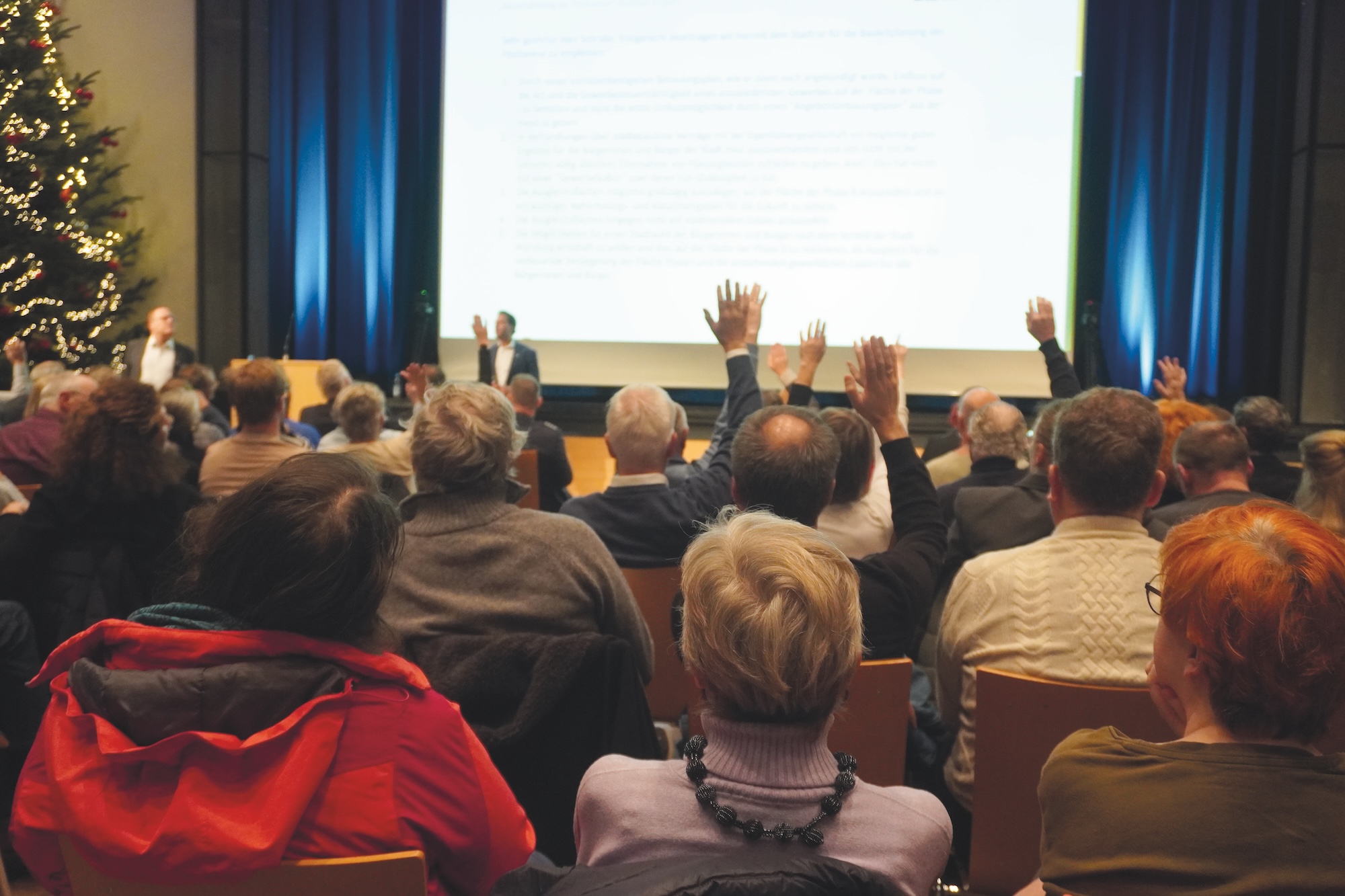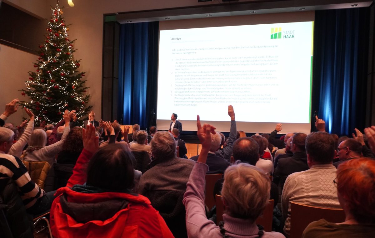 Neu in der Bürgerversammlung sind zwischendurch gestreute Umfragen, die Teilnehmer einladen über ihr Smarthone mitzumachen und die gestellten Fragen des Bürgermeisters zu beantworten. In einer Frage geht es beispielsweise um gewünschte oder fehlende Einkaufsmöglichkeiten. Die Palette der Antworten reicht vom Erotikshop über das „nette“ Café bis zum Indoorspielplatz, vor allem aber scheinen die Haarer eine größere Auswahl in Sachen Shopping (Bekleidung) zu vermissen, genauso wie einen Biomarkt oder eine Kneipe beziehungsweise Bar. Seit Jahren treibt Bukowski die Idee „Circular City“ an und wiederholt die Chance, die sich für die Stadt ergeben können. Lothar Rast meldet sich aus der Bürgerschaft. Rast könne auf 30 Jahre Erfahrung in dem Bereich zurückblicken und bietet Bukowski ein Gespräch an. Jahrzehnte unterstützte Rast in Entwicklungsländern Projekte der Kreislaufwirtschaft. Unter den Begriff „Circular City“ falle einiges und es sei wichtig für Haar das geeignetste Modell zu finden. Johannes Ziegler regt eine Zweckentfremdungssatzung an, um gegen die teilweise jahrelang leerstehenden Wohnung vorgehen zu können. Zwar könne jeder mit seinem Eigentum machen, was er wolle, so Ziegler, aber sozial sei es nicht. Das sei eine sehr harte Vorgehensweise, die kaum Aussicht auf Erfolg habe, meint Bukowski. Andreas Dingler stellt einen Antrag mit gleich mehreren Fragen zur Finckwiese. Mehrheitlich stimmen die Bürger zum einen den vorhabenbezogenen Bebauungsplan auf großzügige Ausgleichsflächen südlich des Gewerbegebiets und zum anderen die Möglichkeit eines Stadtwalds nach Würzburger Vorbild durch den Stadtrat zu prüfen.