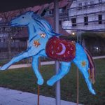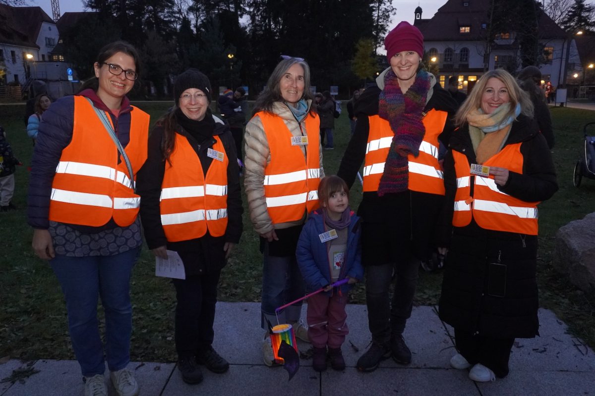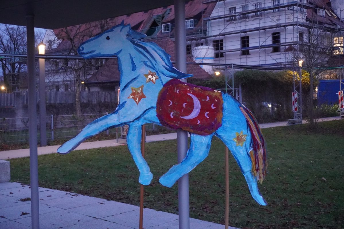 Ein großes blaues gemaltes Papppferd mit einer Satteldecke, die eine Mondsichel ziert und an dessen Hals goldene Sterne funkeln, wartet auf der großen Wiese im Jugendstilpark geduldig auf seinen Einsatz. Der Geräuschpegel auf dem ansonsten sehr ruhigen Plätzchen steigt, denn immer mehr Kinder und Eltern treffen ein, um im Laternenumzug des Familienzentrums (FAM) mitzulaufen. Mitunter sind die Kinder schon „groß“, genau genommen sehr groß, beziehungsweise übertreffen deren Lebensjahre das der Jüngsten um ein Vielfaches: „Es war einfach total schön, dass auch Publikum ohne Kinder da war“, freut sich Natascha Heidemann. Die Leiterin wisse sogar von einer rund 60-jährigen Laternenträgerin: „Sie war einfach dabei, weil sie es schön findet, genauso wie ein Paar. Das finde ich total sympathisch.“ Ganz besonders sei auch die Teilnahme einiger Tagesmütter, die die Gelegenheit nutzen, nicht nur ihre aktuellen, sondern auch ehemaligen Familien zu sehen: „Die standen in Grüppchen zusammen und haben ausgiebig geratscht.“ Auch Anke Sitter kann sich dem Zauber der tanzenden Lichter nach Jahren nicht entziehen: „Meine Jungs sind ja schon groß, aber es ist hier immer so schön, dass ich nach wie vor gerne helfe.“