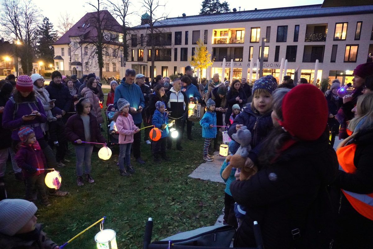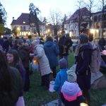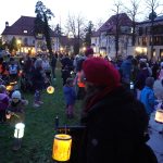 Aufgeregt und mit Stolz auf ihre selbstgebastelten Lichtquellen, warten die Kleinen und Kleinsten und mit leuchtenden Augen auf das Einsetzen des Gesangs. erklärt Heidemann, bevor es dann losrabimmelt und rabammelt. Notenmäßig gelingt das sogar beinahe einstimmig. Als schließlich oben die Sterne leuchten und unten hell die Helfergruppe und rund 150 Teilnehmer, heißt es für die Pferdattrappe „Hopp“ und los geht´s. Es setzt sich wie von Zauberhand an die Spitze und ist das Zeichen zum Aufbruch. Langsam ziehen die Kinder, Babys, Mamas, Papas, Tanten, Onkel, Omas und Opas los und finden sich schließlich im Hof der Maria-Stadler-Hauses ein