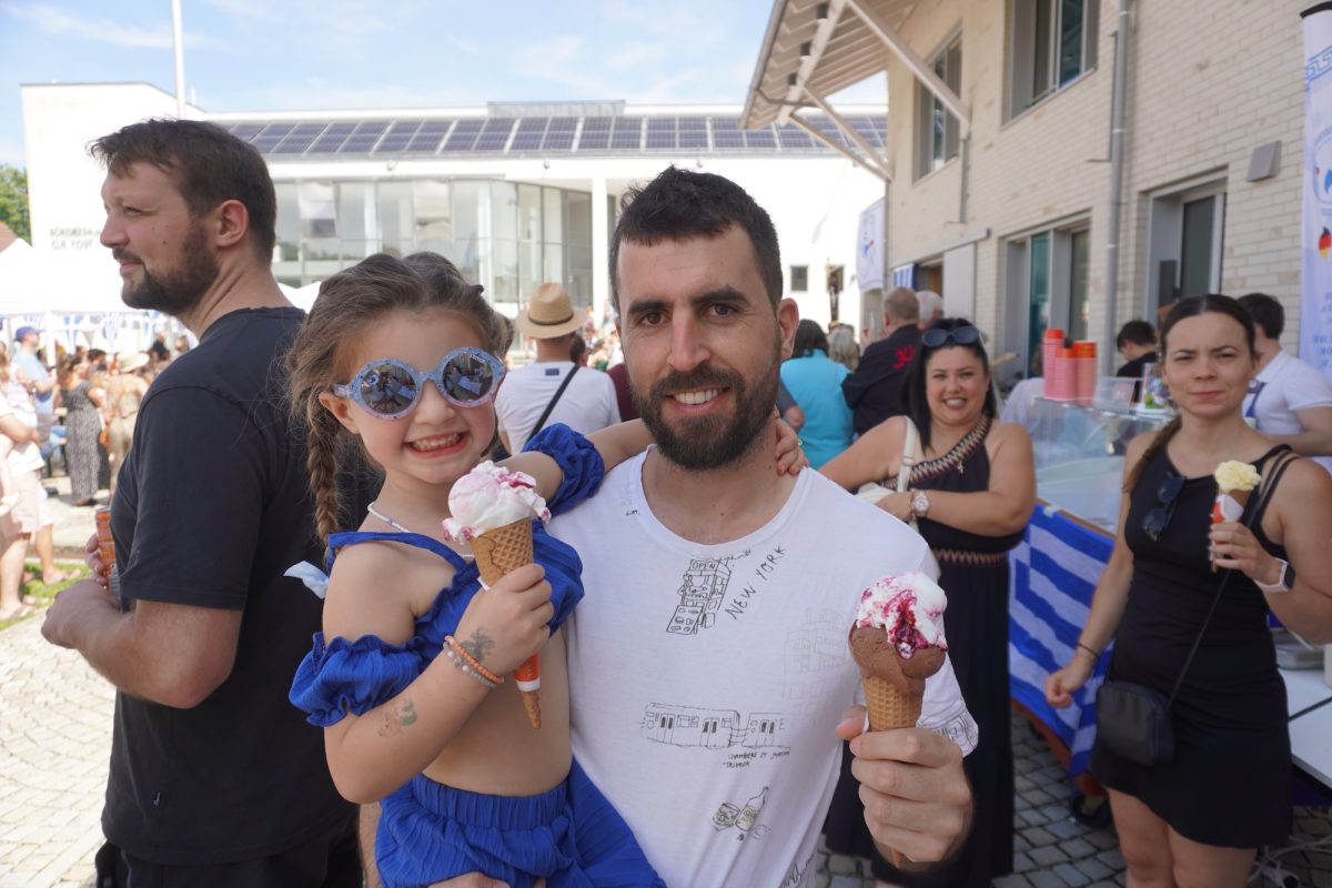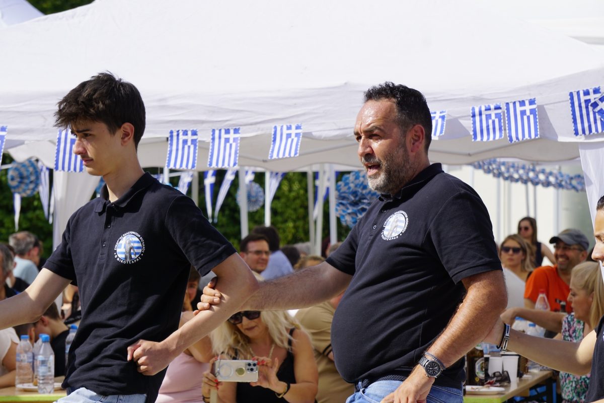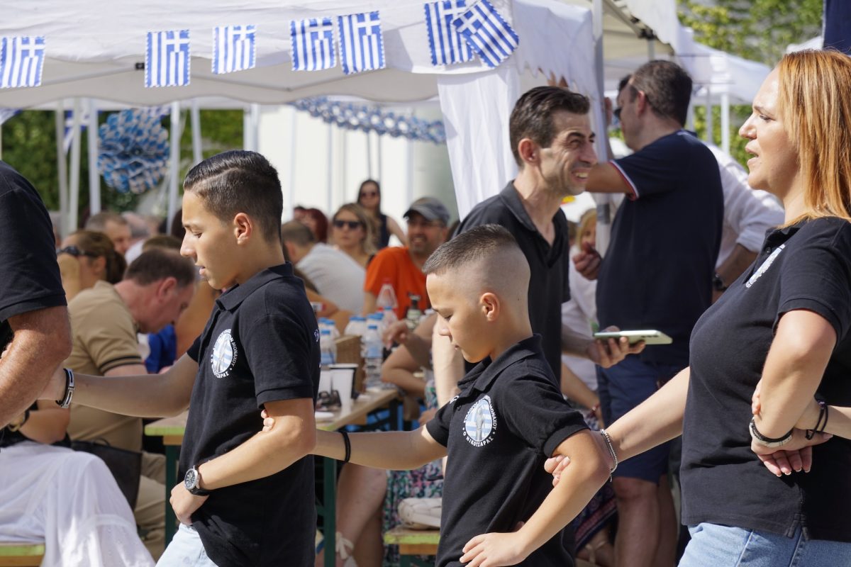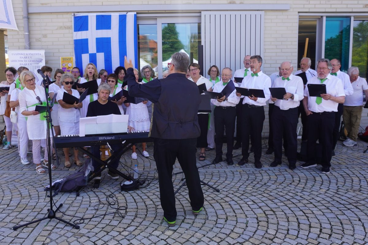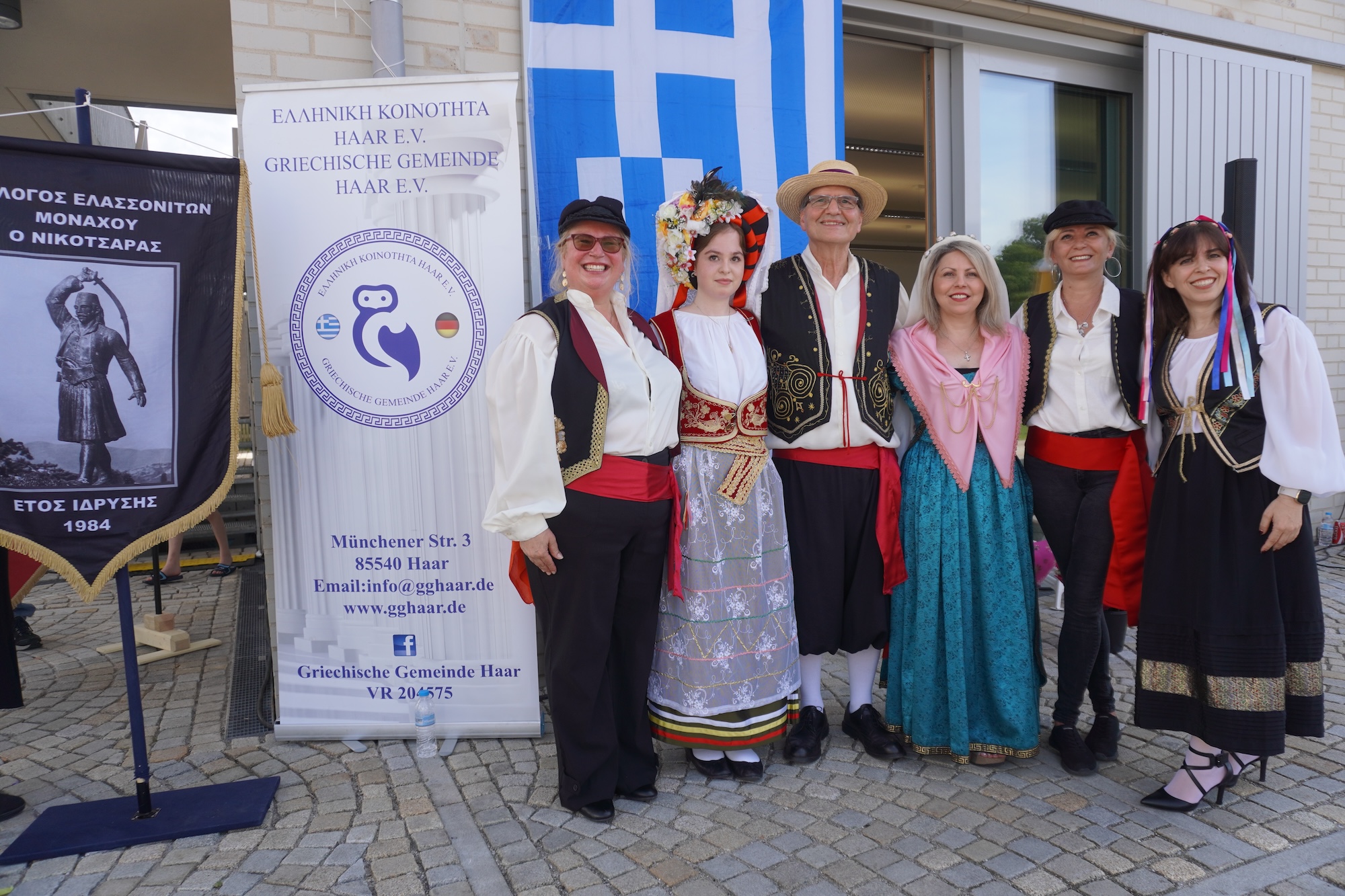Eines scheint so sicher wie das Amen in der Kirche: wenn die Griechische Gemeinde in Haar zum Griechisch-Bayerischen Sommerfest auf dem Haarer Anger lädt, lautet der Dresscode: so bedeckt wie nötig, so luftig wie möglich. Das Thermometer zeigt auch 2025 Temperaturen, wie sie Hellenen sonst eher aus heimischen Gefilden in Südeuropa kennen. Unter weiß-blauen Himmel treibt aber nicht nur die mediterrane Hochsommerhitze den Schweiß auf die Stirn, sondern vor allem der Anblick der atemberaubenden Hebe- und Wurffiguren der Kirnarra sorgen für ein Quäntchen extra Nässe obendrauf. Kirnarra? Ja, ist denn schon wieder Fasching, fragen sich zufällig vorbeikommende Radler beim Anblick der wirbelnden Narrentruppe aus Kirchheim. „Nein“ kommt die beruhigende Antwort und zuprostend von einer Bierbank unter üppigen Sonnenschutz: „Der beginnt, wie gewohnt erst am elften November.“ Die Truppe wolle einfach mit ihrer rasanten Einlage zeigen, was sie könne, und wo wäre das besser möglich als auf einem ohnehin ausgelassenen Fest?