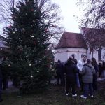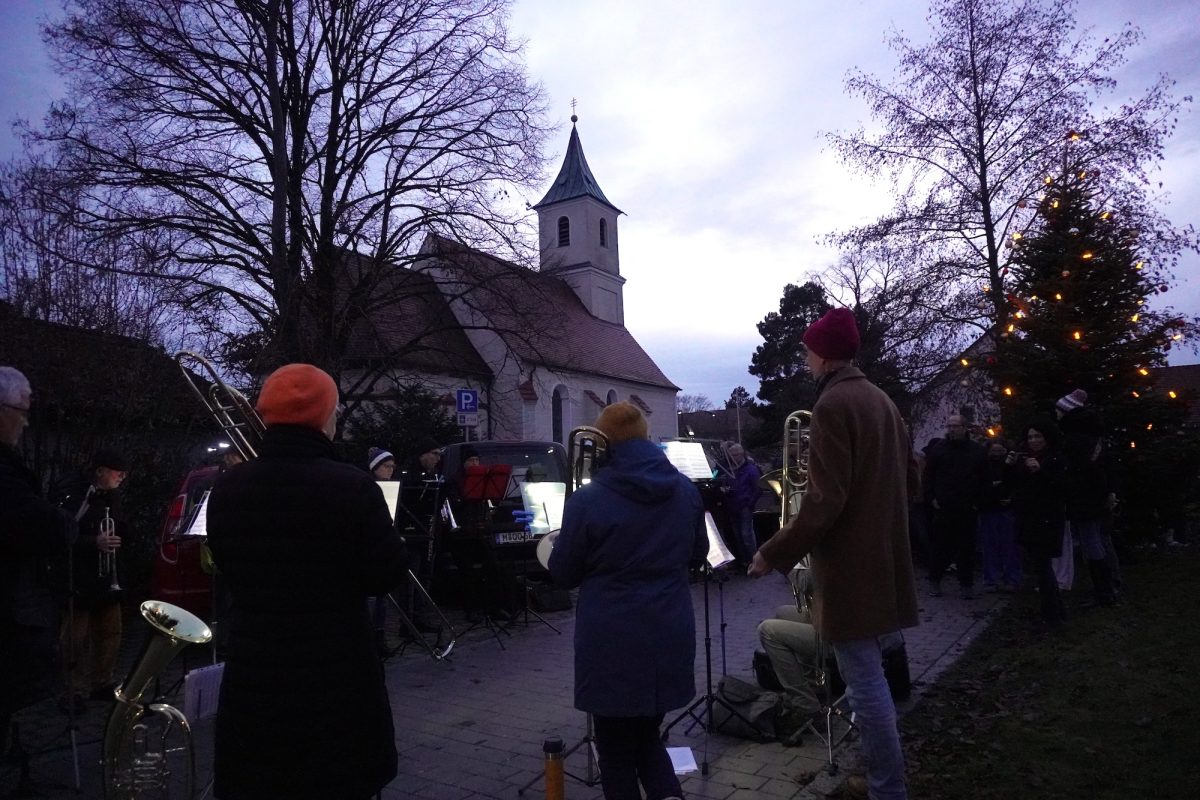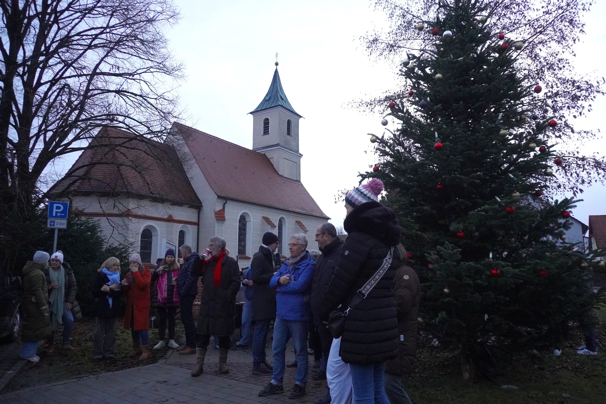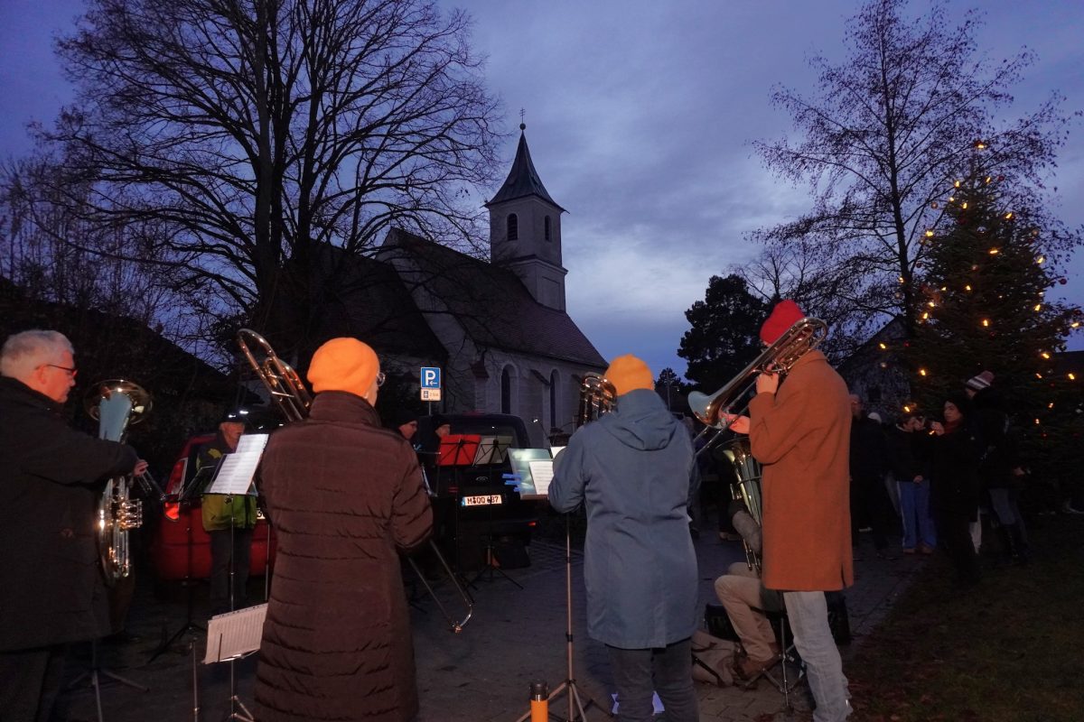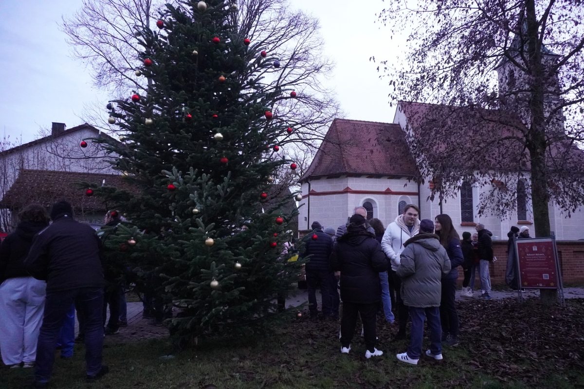 Die Abenddämmerung setzt bereits ein, nach ein paar eisigen Tagen hat Petrus ein Einsehen und schickt moderate bis beinahe milde Temperaturen, so lässt sich ein heißes Haferl Glühwein zur Leberkäs- Semmel ohne Zittern genießen und hebt die Stimmung der Anwesenden. Das gemeinsame Vorglühen am ersten Adventssonntag im Ortsteil hat Tradition. So stehen wie jedes Jahr Salmdorfer Bürger, Mitglieder des Vereins d´Salmdorfer, einige Stadträte verschiedener Fraktionen und der Rathauschef einträchtig auf der Weiherwiese an der Mauer der Kirche Mariä Himmelfahrt zum gepflegten Ratsch oder lauschen den besinnlichen Klängen der Messblecher. D´Salmdorfer lieben ihr Ritual und pilgern nur allzu gerne zu ihrem Baum: „Für uns gehört das einfach zum festen Termin. Dieses Event stärkt die Gemeinschaft bei uns im Dorf, hier kommt einfach Weihnachtsstimmung auf“, ist es überall aus den Reihen zu hören.