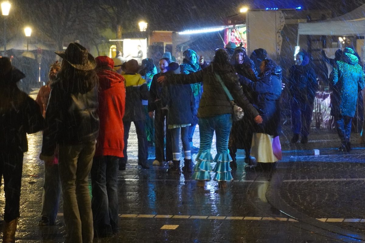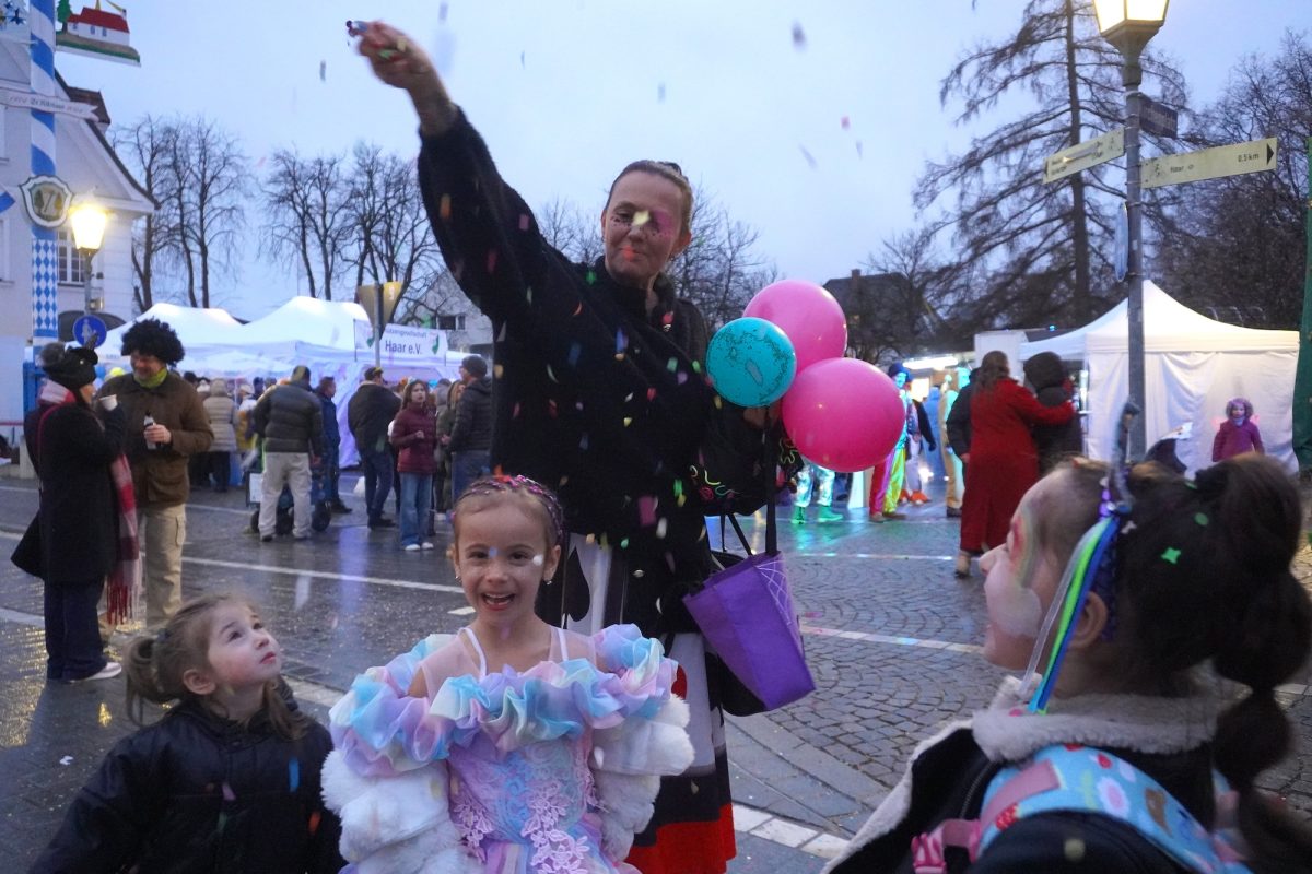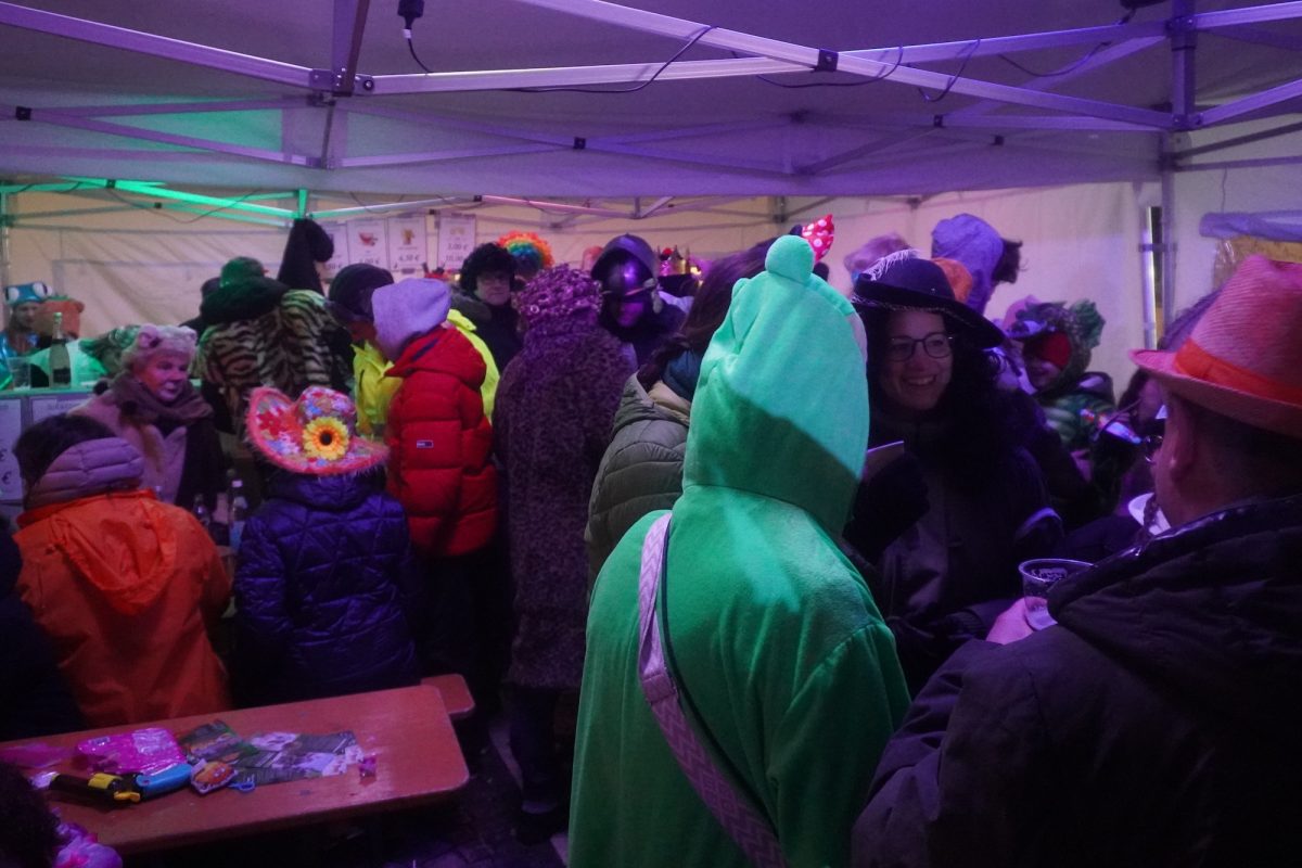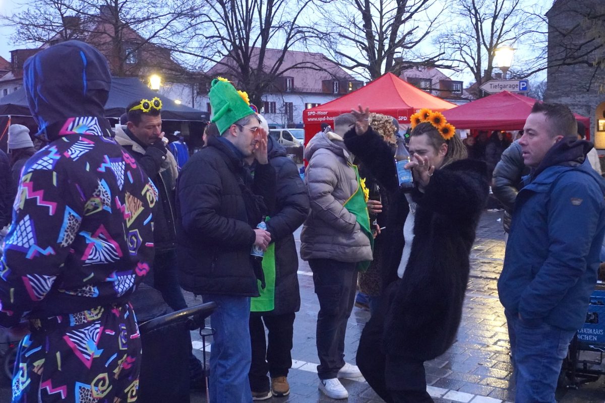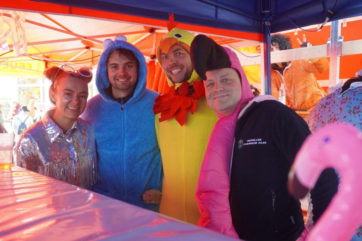 Es ist laut, fröhlich, feucht und in Punkto Optik komplett drüber. An den Ständen von CSU, UBH, SPD, Grüne oder FDP tummeln sich elfenhafte Feen mit Einhörnern, Matrosen und bunten Vögeln, gerne sehr knapp bekleidet. Auch der verrückte Hutmacher hat es aus Alice Wunderland nach Haar geschafft oder Rotkäppchen, genauso der 80er-Jahre Vokuhila und diverse Raubkatzen mit Polyester-Mähne, ob direkt aus dem Dschungel oder der Großstadt bleibt der eigenen Vorstellungskraft überlassen. Für den Getränke- und Essensnachschub und Menschtrauben sorgen neben Haars Freiwilliger Feuerwehr, die Disciples, die Schützengesellschaft und der Vorstand der Griechischen Gemeinde Apostolos Kotsis. Überall stehen schillernde Gestalten, starten eine Polonaise, fallen sich in die Arme und bejubeln den Auftritt der Kirnarra – mit zunehmend glasigen Augen. Es hat etwas von Klassenfahrt 2.0. Kein Wunder, wenn da hier und dort das Dach abhebt, wobei das auch mit dem Wolkenbruch inklusive zapfigen Schneeregen und heftigen Windböen in Zusammenhang steht, der gegen 18.30 unerbittlich den Kehraus ankündigt. Aber in Bayern allgemein und in Haar im Besonderen geht ja „a bisserl ollaweil“, daher lautet das abendliche Maschkera Motto kurzerhand: „Singing and dancing in the rain.“