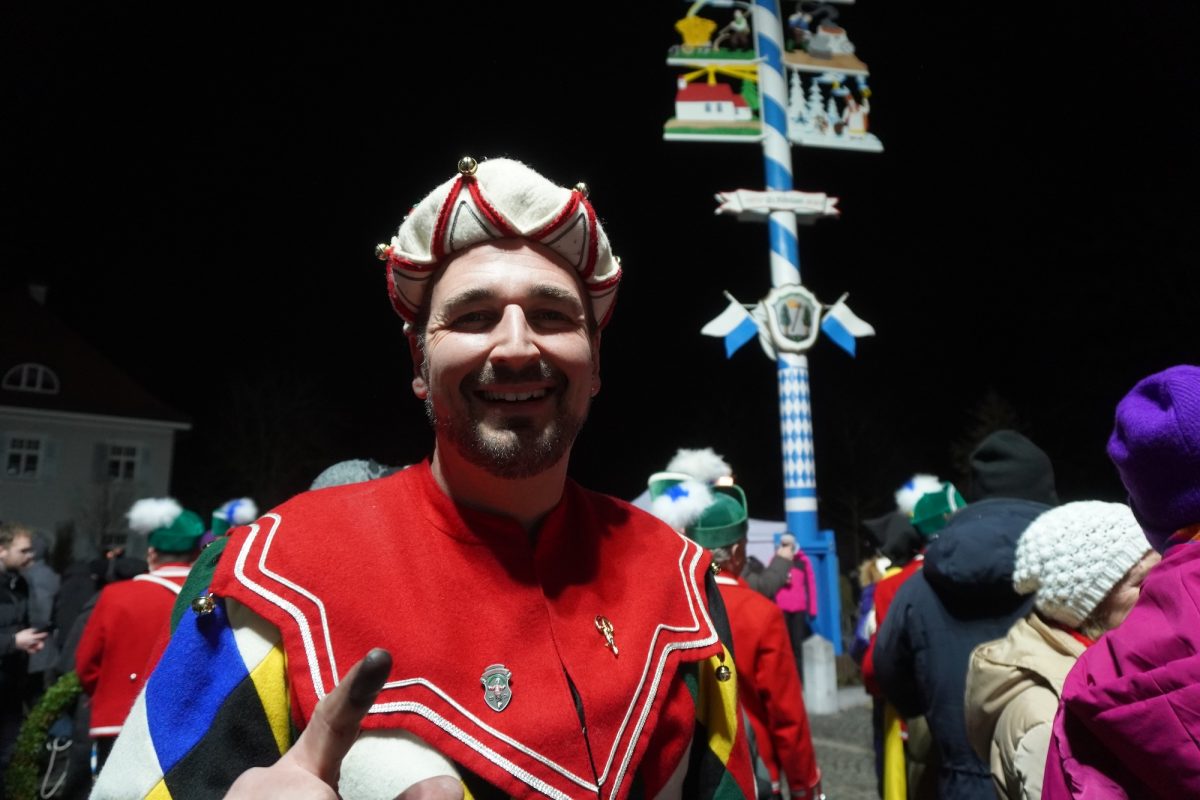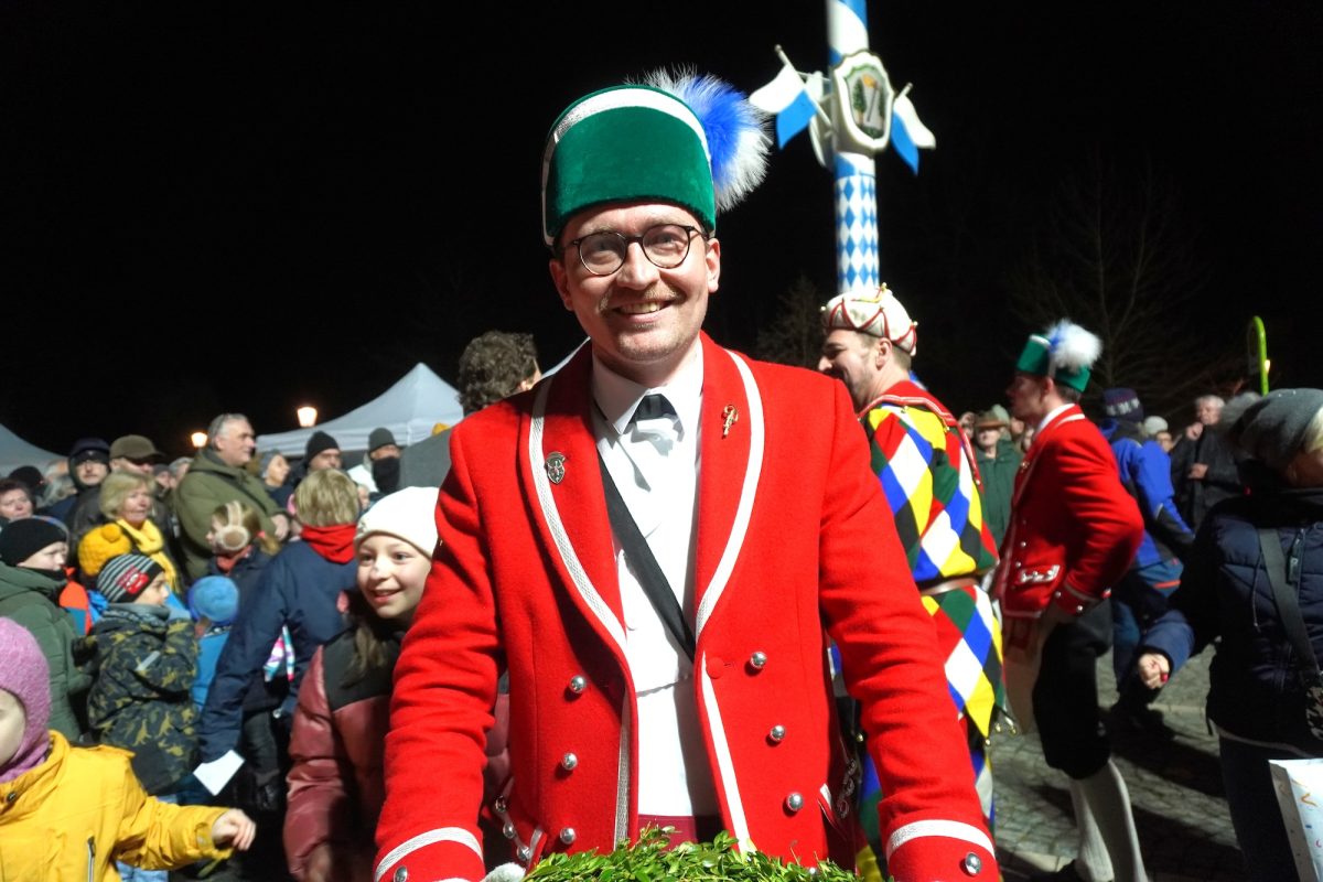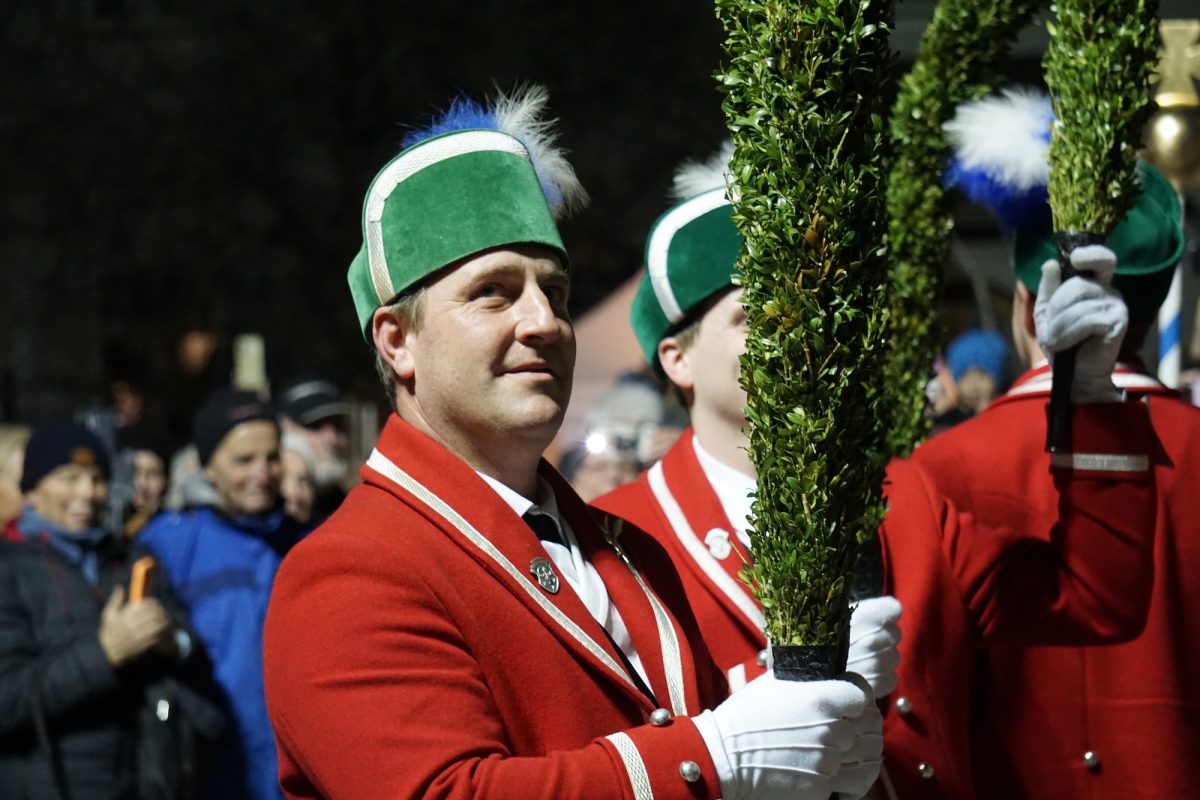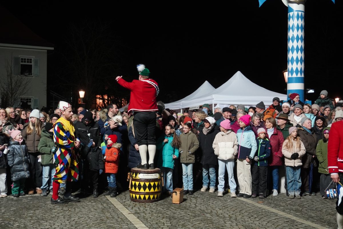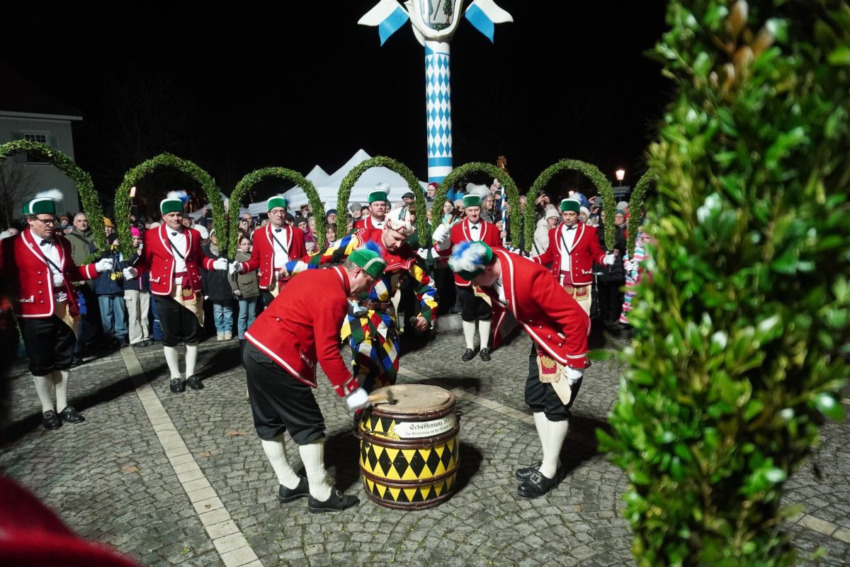 Quasi hautnah kann das Publikum die historischen Tänze verfolgen. 25 Tänzer in traditioneller Kleidung, formen rhythmisch zu bestimmten Liedern der 15 Musiker, mit den verbindenden Buchsbaumbögen unterschiedliche Figuren wie „Kreuz“, „Laube“, „Schlange“ und „Krone“. Ein oder mehrere Kasperle springen dabei immer wieder unvorhergesehen ins Publikum und schwärzen mit Farbe die Nase von Groß und Klein. Es handelt sich um eine begehrte Markierung, denn sie soll Glück bringen. „Das Herausfordernde ist der Schritt. Nach zwei normalen Schritten folgt das Schlürfen. Den muss man verinnerlichen. Danach kann man sich auf die Choreografie konzentrieren“, erklärt Schiedermeier, der auf eine lange Schäffler-Tradition in der Familie blicken kann. Bereits dessen Ur-Urgroßvater beweist vor 152 Jahren als Mitglied im Fachverein der Schaeffler München seine tänzerischen Fähigkeiten: „Mein Urgroßvater mütterlicherseits hat es weitergeführt, war 1914 und 1921 Vortänzer und meine Mutter war 1949 als Siebenjährige und 1956 das Münchner Kindl, denn wir haben ja unser eigenes Mönchlein mit dabei.“ Schäffler müsse heute allerdings niemand mehr sein. Jeder sei im Verein willkommen, der „das Herz am rechten Fleck und Spaß an der Tradition hat“, so Schiedermeier: „Matthias Fürst, Leiter im Haarer Bauamt, ist Mitglied bei uns. Er hat sich durch die vielen Tanzroben durchgekämpft, es toll gemeistert und ist jetzt ein fester und wichtiger Bestandteil unserer Gruppe.“