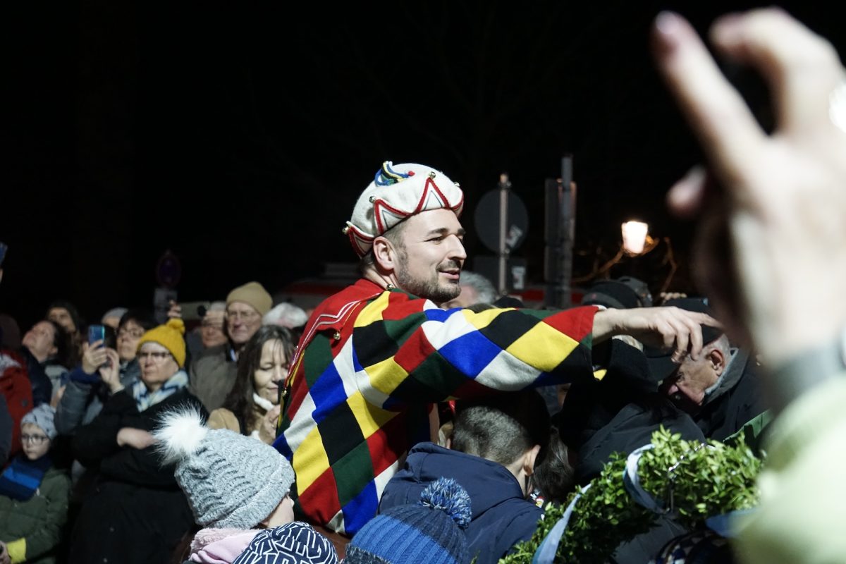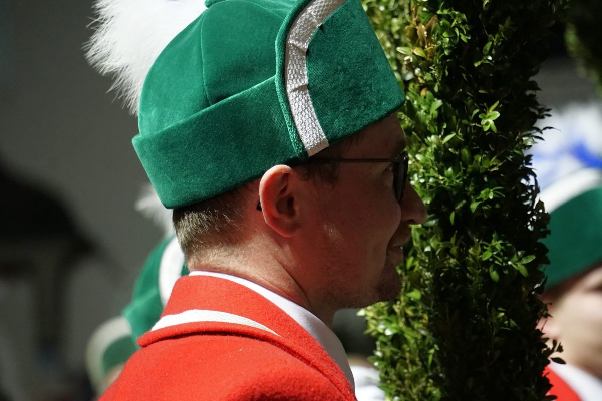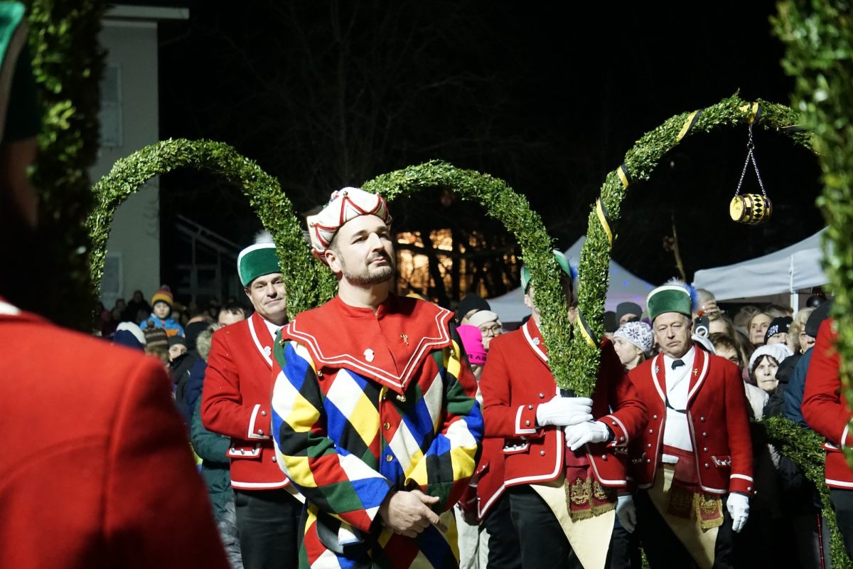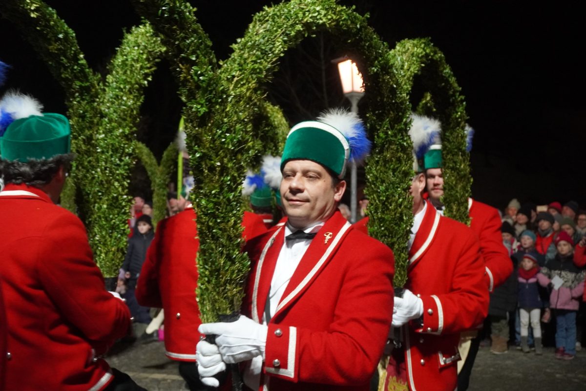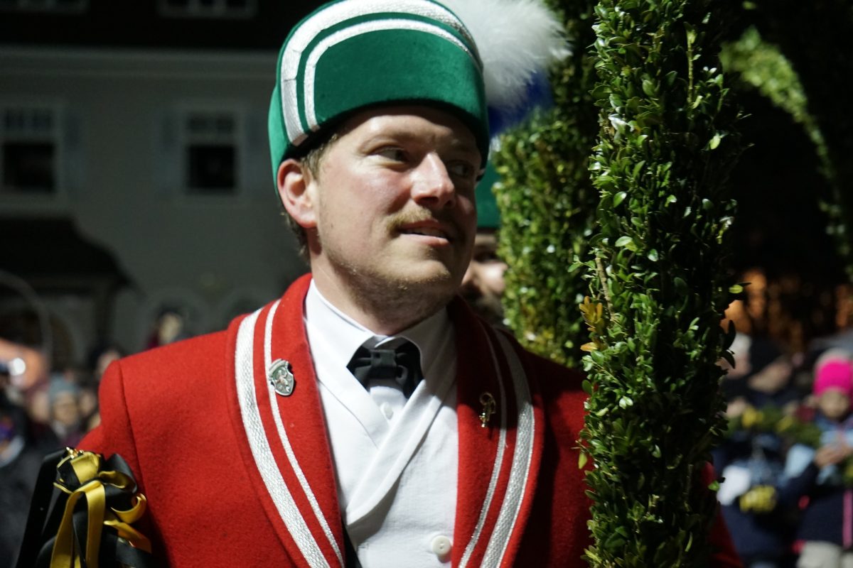 Quasi hautnah kann das Publikum die historischen Tänze verfolgen. 25 Tänzer in traditioneller Kleidung, formen rhythmisch zu bestimmten Liedern der 15 Musiker, mit den verbindenden Buchsbaumbögen unterschiedliche Figuren wie „Kreuz“, „Laube“, „Schlange“ und „Krone“. Ein oder mehrere Kasperle springen dabei immer wieder unvorhergesehen ins Publikum und schwärzen mit Farbe die Nase von Groß und Klein. Es handelt sich um eine begehrte Markierung, denn sie soll Glück bringen. „Das Herausfordernde ist der Schritt. Nach zwei normalen Schritten folgt das Schlürfen. Den muss man verinnerlichen. Danach kann man sich auf die Choreografie konzentrieren“, erklärt Schiedermeier, der auf eine lange Schäffler-Tradition in der Familie blicken kann. Bereits dessen Ur-Urgroßvater beweist vor 152 Jahren als Mitglied im Fachverein der Schaeffler München seine tänzerischen Fähigkeiten: „Mein Urgroßvater mütterlicherseits hat es weitergeführt, war 1914 und 1921 Vortänzer und meine Mutter war 1949 als Siebenjährige und 1956 das Münchner Kindl, denn wir haben ja unser eigenes Mönchlein mit dabei.“ Schäffler müsse heute allerdings niemand mehr sein. Jeder sei im Verein willkommen, der „das Herz am rechten Fleck und Spaß an der Tradition hat“, so Schiedermeier: „Matthias Fürst, Leiter im Haarer Bauamt, ist Mitglied bei uns. Er hat sich durch die vielen Tanzroben durchgekämpft, es toll gemeistert und ist jetzt ein fester und wichtiger Bestandteil unserer Gruppe.“