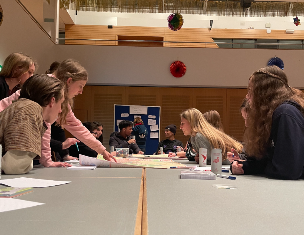 Im Anschluss wurden die Jugendlichen in Gruppen eingeteilt. Jede Gruppe wurde von jeweils zwei Ansprechpersonen aus dem Rathaus begleitet. An vier thematischen Stationen – basierend auf den Ergebnissen des Jugendworkshops – hatten die Gruppen jeweils 15 Minuten Zeit, ihre Ideen, Kritikpunkte und Lösungsvorschläge zu diskutieren und zu konkretisieren.
