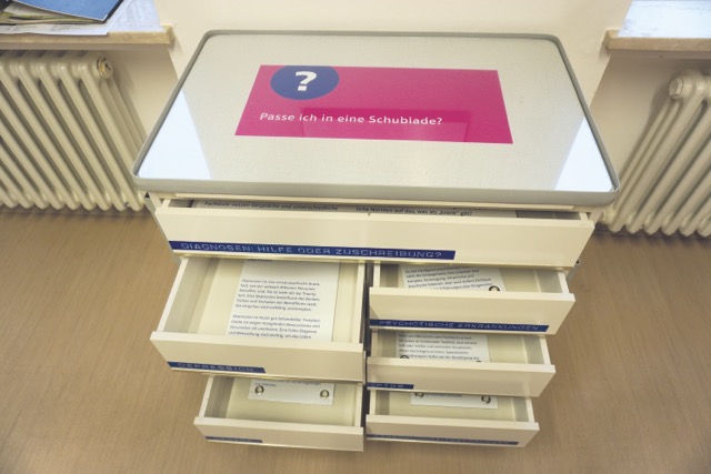 Die Ausstellung widmet sich der Kernfrage, warum psychische Erkrankungen nach wie vor mit Vorurteilen behaftet sind und warum es bis heute schwierig ist, darüber zu sprechen. „Das ist schade. Es herrschen immer noch komische Bilder im Kopf. Hier will die Klinik eine Schnittstelle schaffen, um Fragen stellen zu können. Man muss aber auch sagen: Manche bleiben ungeklärt.“ Direkt gegenüber vom Eingang steht eine schlichte, weiße Kommode. Jedes Schubfach steht für eine Diagnose: „Wir zeigen hier Krankheiten auf, die am häufigsten auftreten. Davon werden einige unterschätzt. Zum Beispiel ist eine Depression nicht einfach „nur Traurigkeit“. Es handelt sich um eine Erkrankung, die behandelt werden kann, wenn sie frühzeitig erkannt wird und man weiß, wohin man sich wenden kann. Im besten Fall wäre eine Gesellschaft ohne Schubladendenken wünschenswert“, so Penzel. Die Entwicklung „hin zum Individuum“, in der jeder Einzelne mit seinem ganz speziellen Krankheitsbild zähle, sei wichtig, betont Penzel. Das setze einen „kleinen Perspektivwechsel“ voraus, für den die Ausstellung sorgen will: „Wir stellen den Menschen stärker in den Mittelpunkt, so wie es in den 70ern gefordert wurde. Jeder kann sich hier über das große Netzwerk für Menschen mit psychiatrischen Erkrankungen ein Bild machen.“ Penzel und vor allem das Museumsteam wünschen sich mit möglichst vielen Haarern ins Gespräch zu kommen, „die vielleicht die eine oder andere neue Frage hinterlassen.“