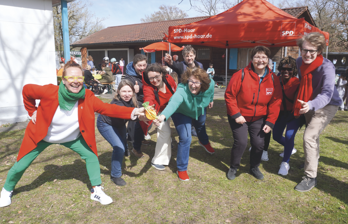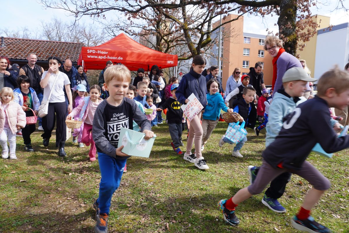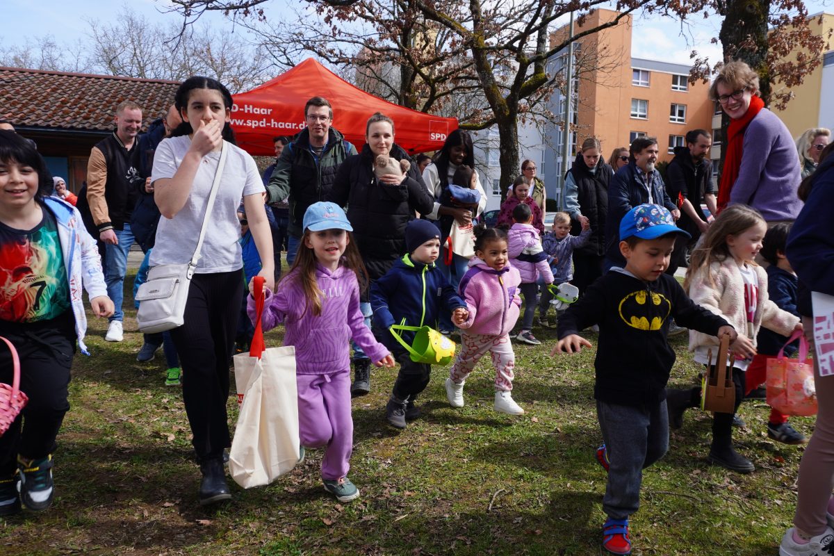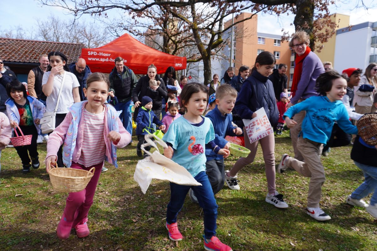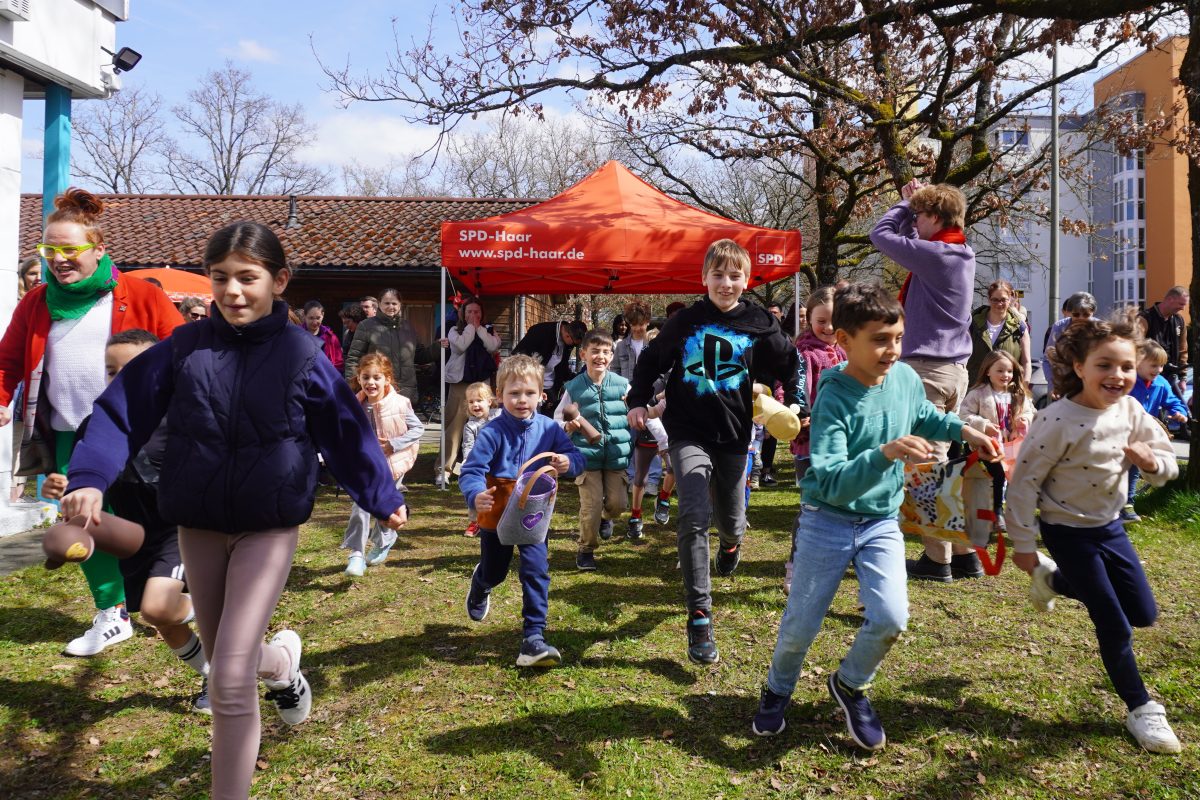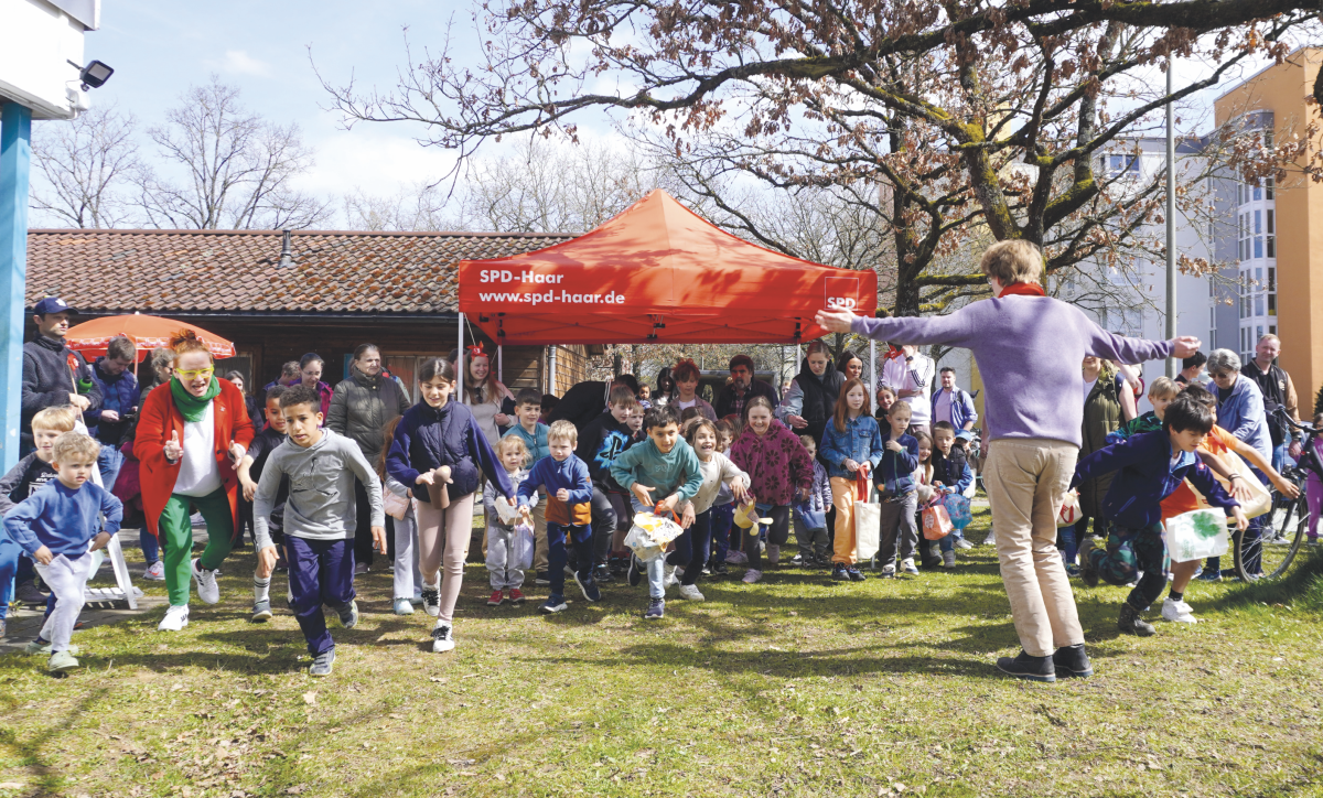 „Wer glaubt denn noch an den Osterhasen?“ Das ist eine Frage, die so überflüssig erscheint wie der Eierwärmer fürs Überraschungsei, der Schokohase in einer finnischen Sauna oder das Hühneraugenpflaster für den Osterhasen. “Klar gibt es den!” Hier sind sich die vielen Kinder einig, die am Ostermontag vor dem DINO auf den Startschuss warten. „Das Ostereiersuchen ist ja bei vielen bereits ein fester Termin im Kalender“, meint “Osterhäsin” und Stadträtin Sarah Schottlaender (SPD) und lächelt verschmitzt: „Wir sind ganz fleißig beim Verstecken, das ist gar nicht so einfach, denn leider ist unser Suchgebiet ja wegen der Baustelle in diesem Jahr deutlich verändert.“ Einstweilen versucht Haars SPD-Vorstand Raul Würfl die nach Schokoeier hungernde Meute am Ausgangspunkt zurückzuhalten. Denn die steht höchst ungeduldig am Start, ausgerüstet mit Körbchen oder Taschen, um die spätere Beute abtransportieren zu können.