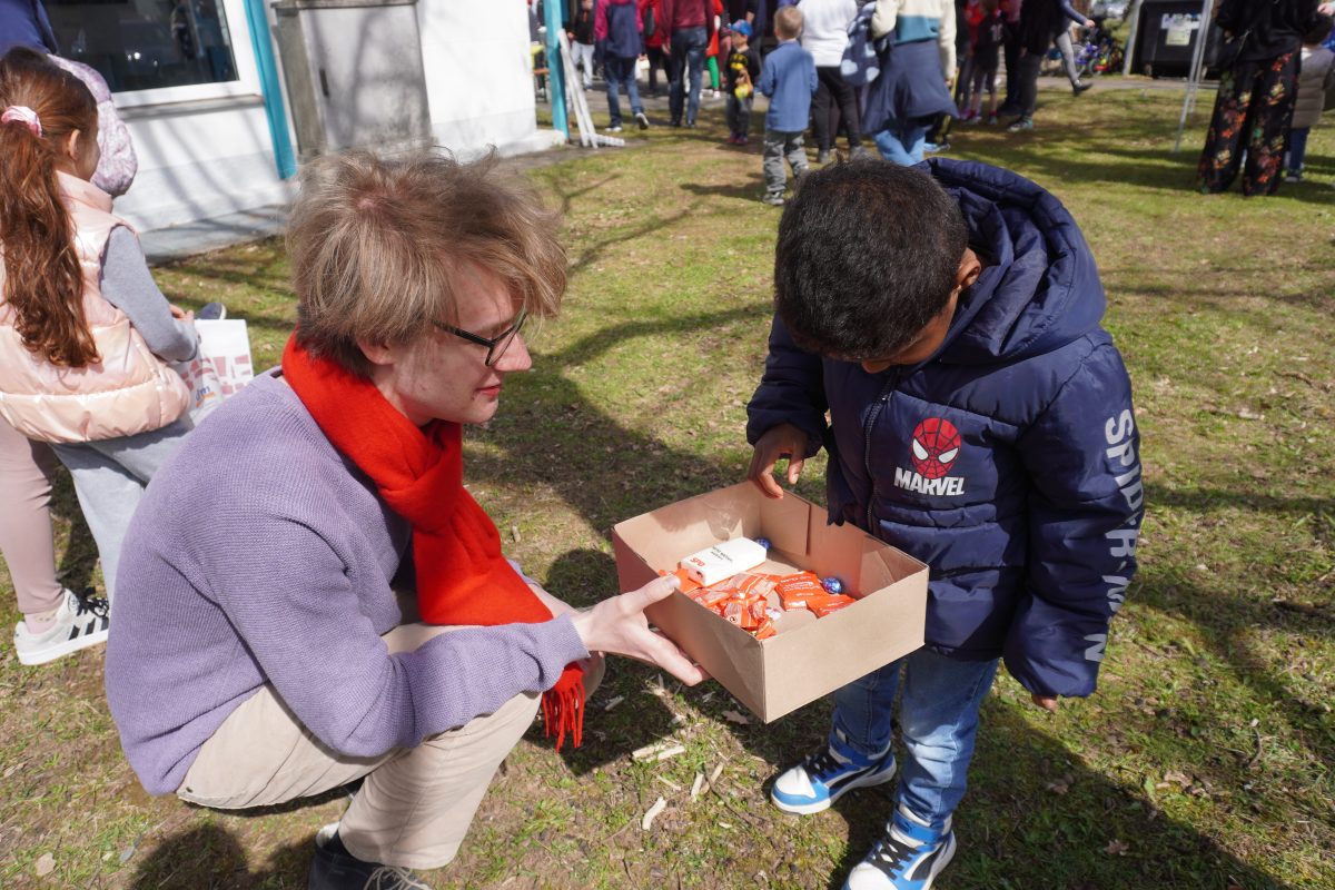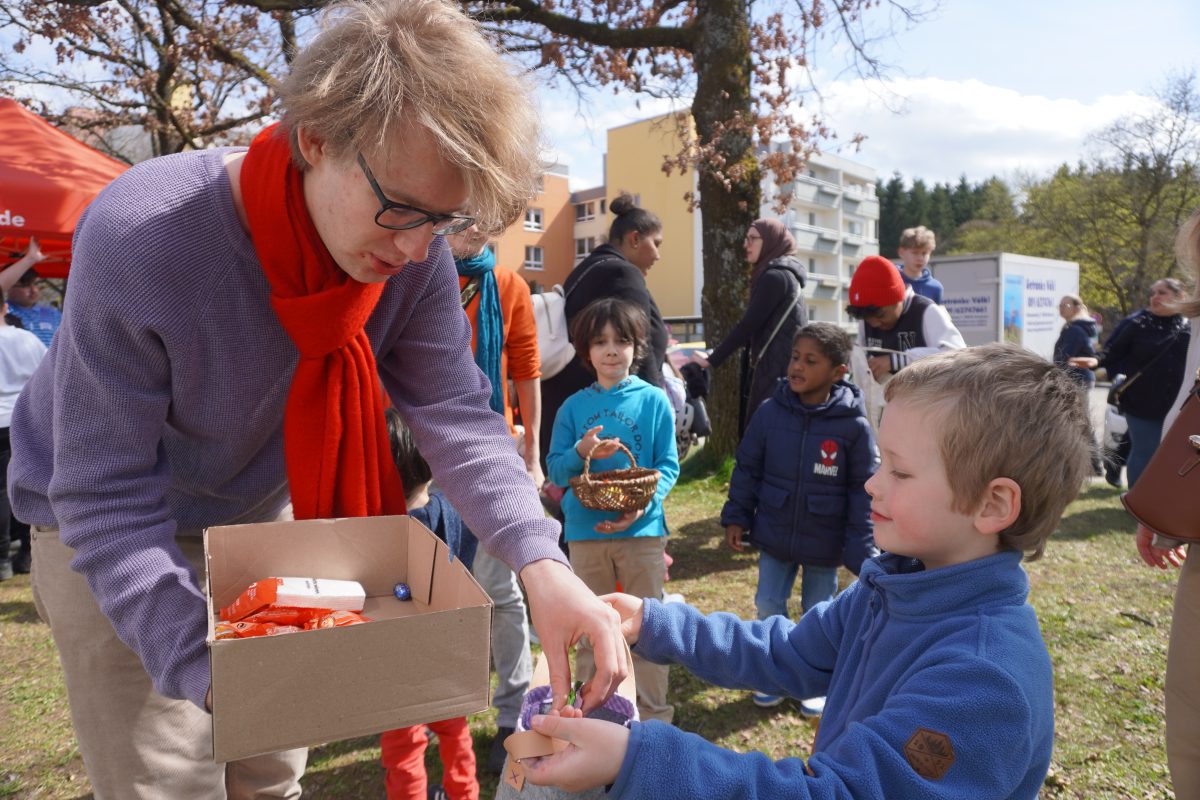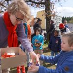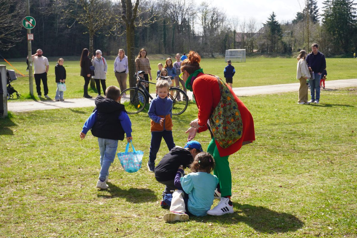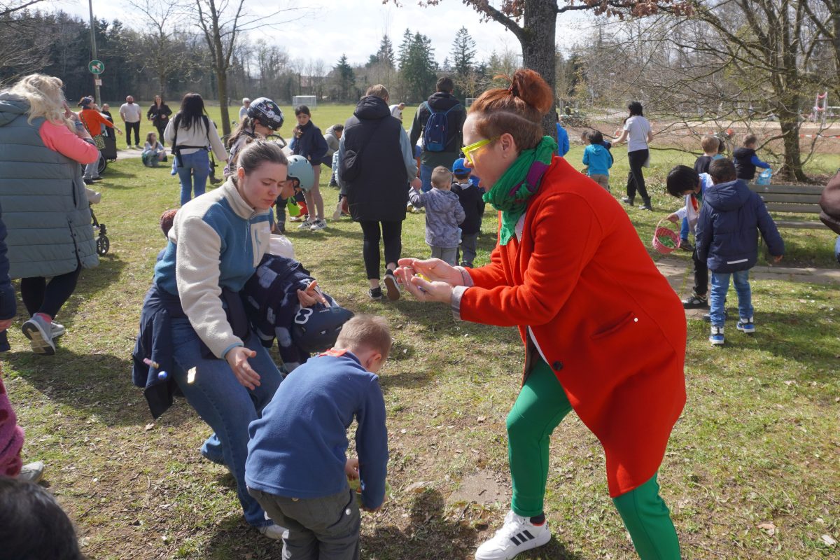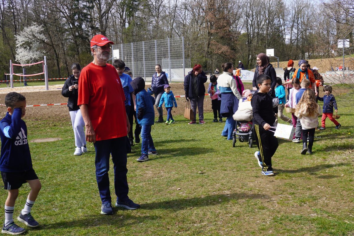 Während die Jüngsten noch ein wenig planlos von einem Bein auf das andere hopsen, scannen die Erfahreneren unter ihnen mit hochkonzentriertem Kennerblick das abgesteckte Areal ab, um sich die Stellen zu merken, wo sich gerade noch fleißige Hasen tummeln. Die springen schnell von einem Busch zum anderen und verteilen die „Must-haves“ des Tages. Auch der Nachwuchs, wie Teenagerhase Samuel, hoppelt mit und verteilt großzügig die Objekte der Begierde: „Für die Suche bin ich inzwischen zu alt, aber es macht riesig Spaß, Eier für die kleineren zu verstecken.“ Irgendwann hopst auch der letzte Langohr an den Rand des Feldes und gönnt sich ein kleines Verteiler-Päuschen. Für Raul Würfl der richtige Zeitpunkt den Countdown auszurufen: „10, 9, 8 … 1“ und schon stürmt die Kinderschar los, gefolgt von der dienenden „Trägerschaft“ Eltern, die inzwischen die Transportmittel wie Körbchen, hinterhertragen müssen. „Ich habe eins“, „Ich auch“ und „Hier ist eins“, tönt es freudig aufgeregt von allen Seiten.