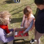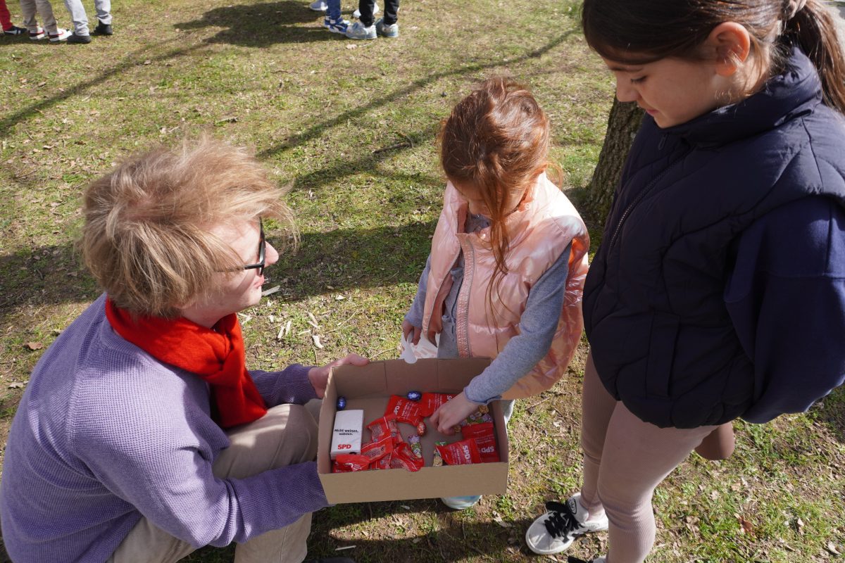 Mit großer Begeisterung stürzen sich die Kinder auf das, was Osterhenne Astrid Herrmann legt.