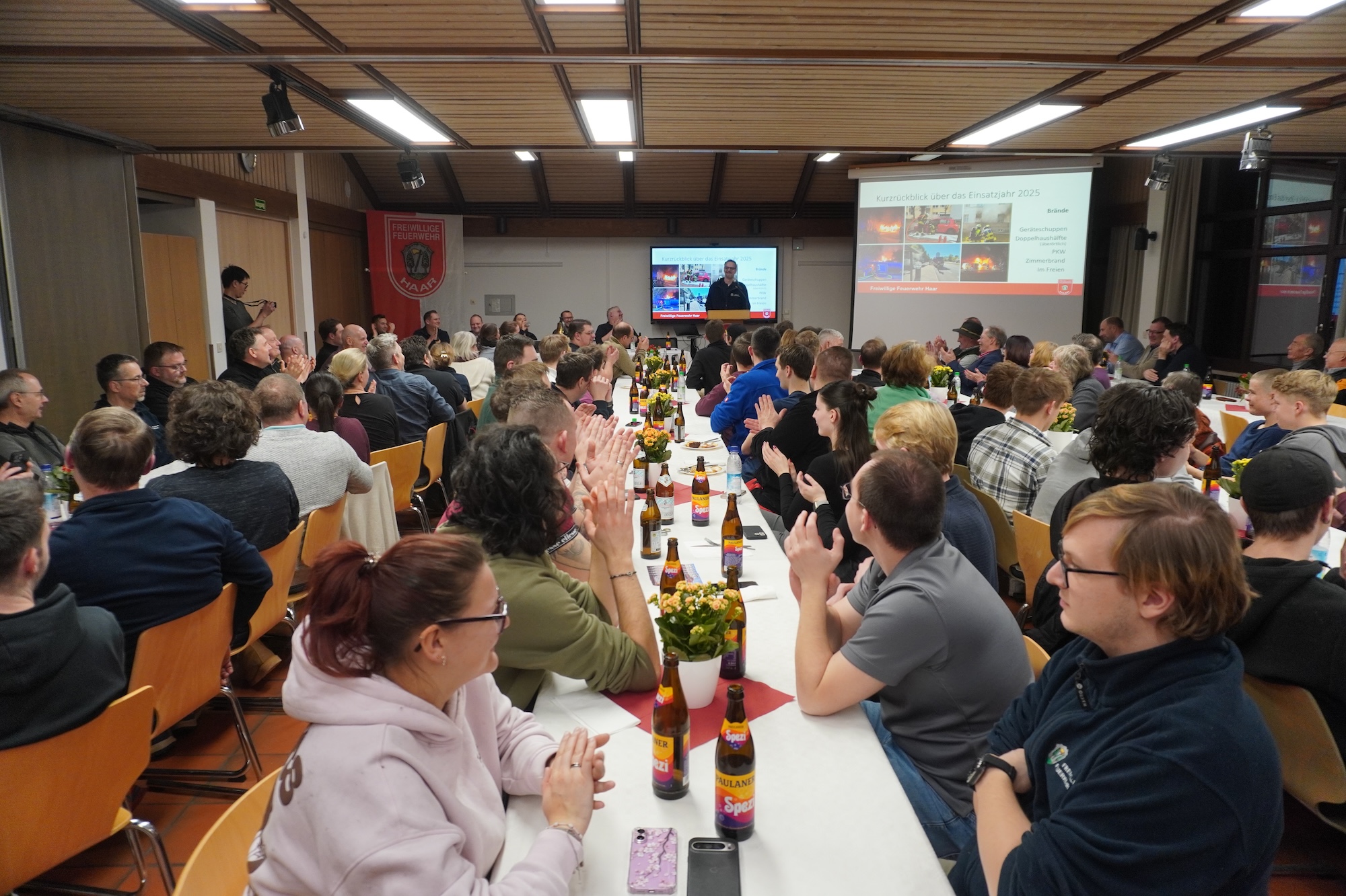 „398 Einsätze, das ist wieder ein Anstieg, verglichen mit den Vorjahren“, kommentiert Kommandant Arne Seifert die Einsatzzahlen der Freiwilligen Feuerwehr Haar auf der Jahreshauptversammlung. Dabei reiche das „Geschäft“ vom einfachen Löschen eines Müllcontainers bis zu aufwändigen Einsätzen bei Verkehrsunfällen auf der A99. Klassische Brandeinsätze verlieren allerdings zunehmend an Bedeutung und machen lediglich zwölf Prozent in der Statistik aus. Meist gehe es um technische Hilfeleistungen, so Seifert: „Inzwischen machen Wohnungsöffnungen unser „Tagesgeschäft“ aus, das sind rund 59 Prozent.“ Beachtlich sind die Zahlen der Einsatzstunden, die die Ehrenamtlichen leisten. Insgesamt sind es etwa 5400 Stunden, dazu addieren sich 7500 für die Aus- und Fortbildung. „Wenn man jetzt noch den „Arbeitsweg“ hinzuaddiert, komme ich auf etwa 6,5 Stunden. Also genau genommen sprechen wir von fast einem Arbeitstag pro Woche für jeden“, verdeutlicht Seifert.
