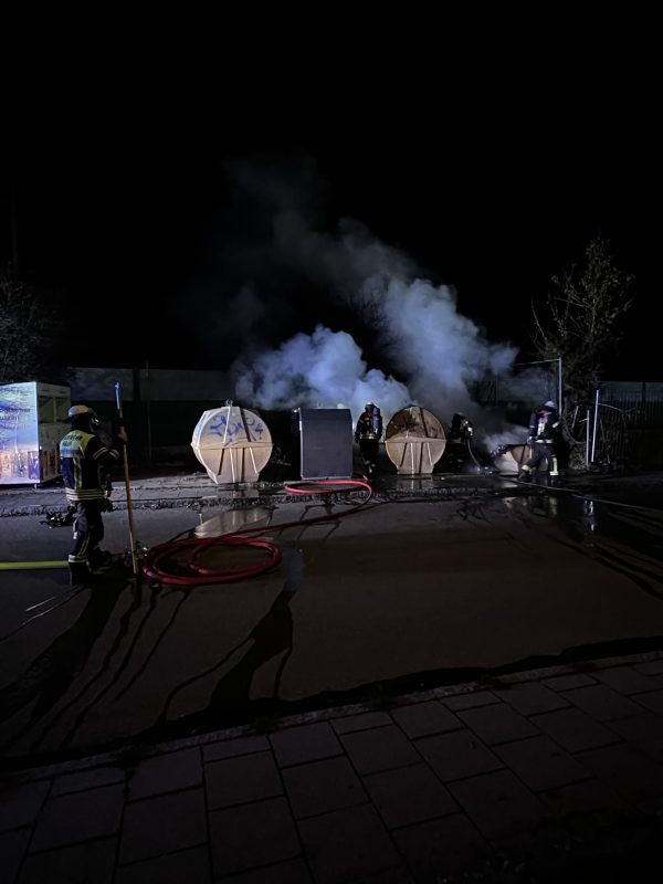 In der Nacht vom 20.11.25. wurde die Freiwillige Feuerwehr Haar um 0.07 Uhr mit dem Einsatzstichwort „B2 – Brand im Freien – Brand Container“ zur Brandbekämpfung gerufen. Bei Eintreffen der Einsatzkräfte bestätigte sich der Alarm: Vier Papiercontainer auf einer Wertstoffinsel, die sich in unmittelbarer Nähe zur S-Bahn-Strecke befindet, standen im Vollbrand. Fünf Atemschutzgeräteträger gingen zur Brandbekämpfung vor und leiteten die Löschmaßnahmen unter Verwendung von zwei C-Rohren ein. Im Anschluss an die Groblöschung wurde die Einsatzstelle mit einer Wärmebildkamera auf Glutnester kontrolliert. Für eine vollständige Löschung und um ein Wiederaufflammen zu verhindern, wurden die Glutbereiche zusätzlich mit einer Löschlanze behandelt und das Brandgut mit einem Gemisch aus Wasser und Netzmittel abgelöscht.